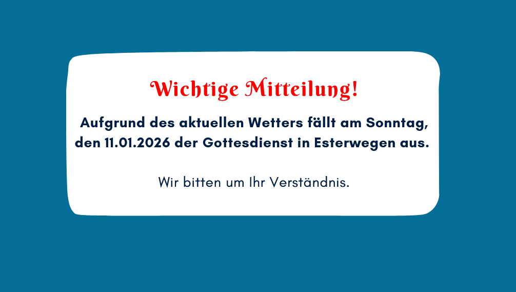 Der Sonntags-Gottesdienst der Martin-Luther-Kirche (Dorfplatz 3, 26897 Esterwegen) findet um 9 Uhr außer jeden 3. Sonntag im Monat statt. Dann ist um 10 Uhr ein modernerer Gottesdienst mit Beteiligung unserer Band Spirit Power und ohne traditionelle Liturgie. Anschließend treffen wir uns zum gemütlichen Beisammensein mit Tee & Kaffee.