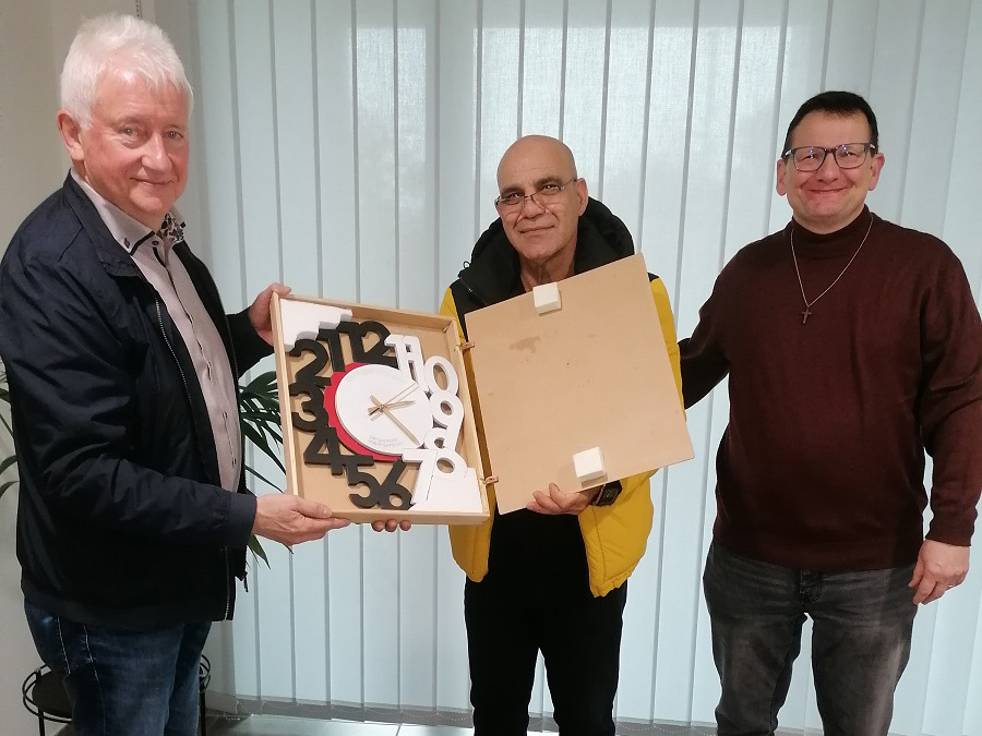 Herr Layth schenkte aus tiefer Dankbarkeit und Verbundenheit der Samtgemeinde Nordhümmling und der Gemeinde Esterwegen die Uhr, die vom Samtgemeindebürgermeister/Gemeindedirektor Christoph Hüntelmann im Beisein von Pastor Dr. Markus Auffermann entgegengenommen wurde.